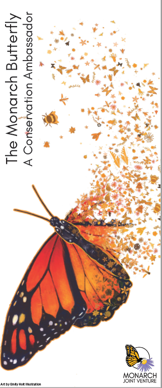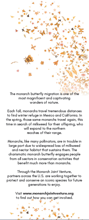 The charismatic monarch butterfly engages people from across all sectors in conservation activities that benefit much more than monarchs. Through the Monarch Joint Venture, partners across the U.S. are working together to protect and conserve an iconic species for future generations to enjoy. Use this bookmark at outreach events to show the monarch as a pollinator ambassador!
