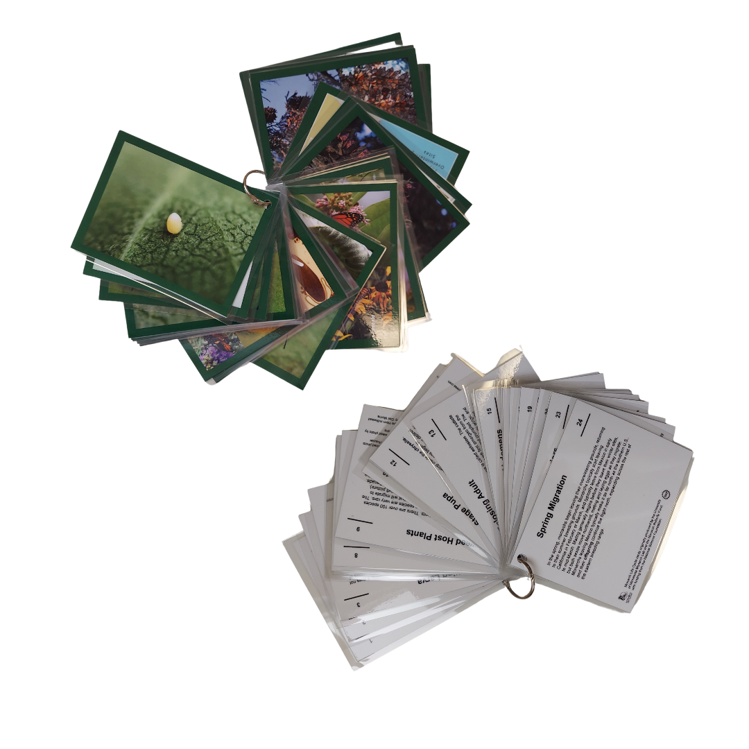 This English card set includes 24 cards highlighting the life cycle, migration, and natural history of the monarch butterfly. Each digital color image is backed by a brief summary of the unique characteristics used for easy identification of the monarch in all stages of its life cycle. These are a great tool to use in the classroom, in the field while out monitoring for a monarch community science program, or to help build your general knowledge about monarchs. This set is held together by a book ring, so you can easily flip through the set without worrying about losing any of the cards!